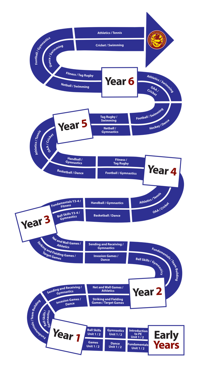 The PE curriculum is built to ensure that each child’s journey follows a clear progression ladder. Children build on the skills and knowledge learnt in previous years to make progress as they move through school.