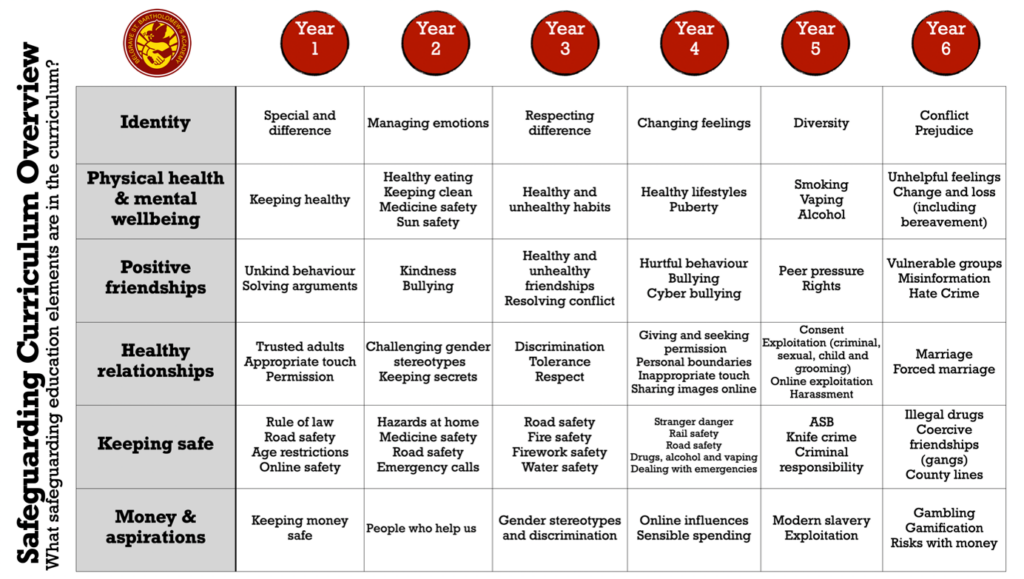 Our bespoke curriculum covers the statutory requirements of RSE and SMSC development and provides our children with the knowledge and personal skills to be able to navigate the extra-familial safeguarding challenges of our local community and the wider world.